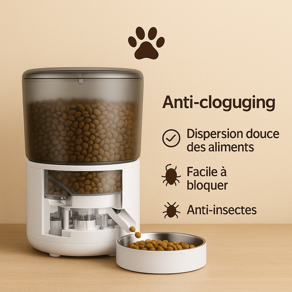 Sécurité : arrêt automatique si présence détectée ; mécanisme inaccessible au chat.