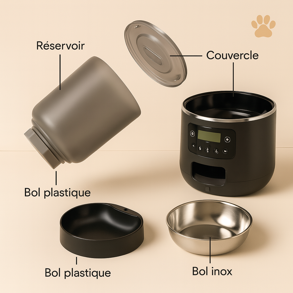 Appli mobile : historique des passages, niveau du tiroir (9 L), rappels d’entretien, notifications d’anomalie.